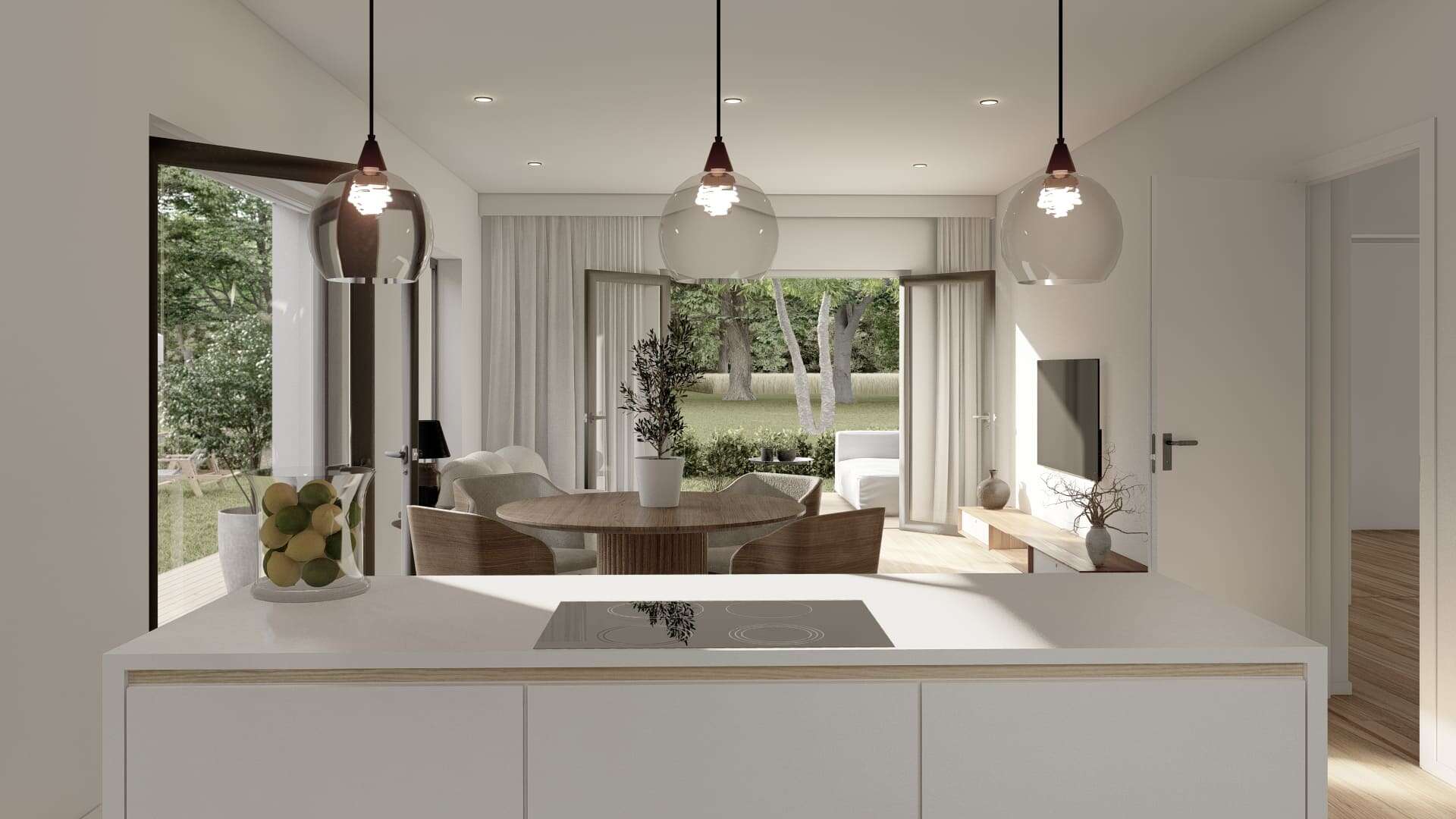 Das Erdgeschoss empfängt dich mit einem großzügigen Wohn-, Koch- und Essbereich, in dem bodentiefe Fenster für viel Tageslicht sorgen. Die Kochinsel ist Treffpunkt und Arbeitsplatz zugleich, während ein separater Bürobereich ideal für Home-Office oder kreatives Arbeiten ist.