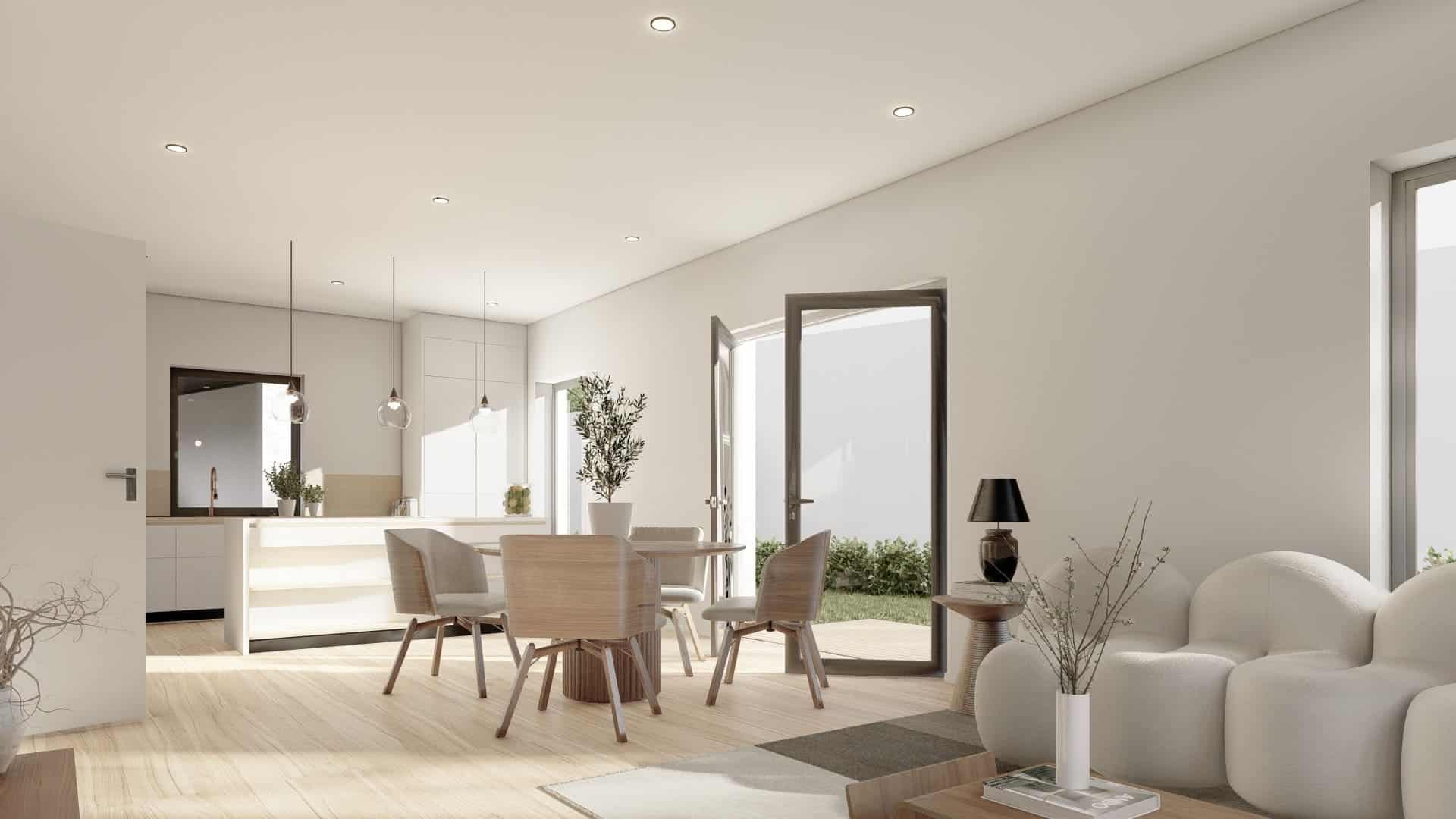 Offene Räume, bodentiefe Fenster und filigrane Fensterbänke schaffen lichtdurchflutete Wohnwelten. Fußbodenheizung, ein smartes Lüftungssystem und die durchgängige Barrierefreiheit – vom Erdgeschoss bis ins DG – sorgen für maximalen Wohnkomfort in jeder Lebenssituation.
